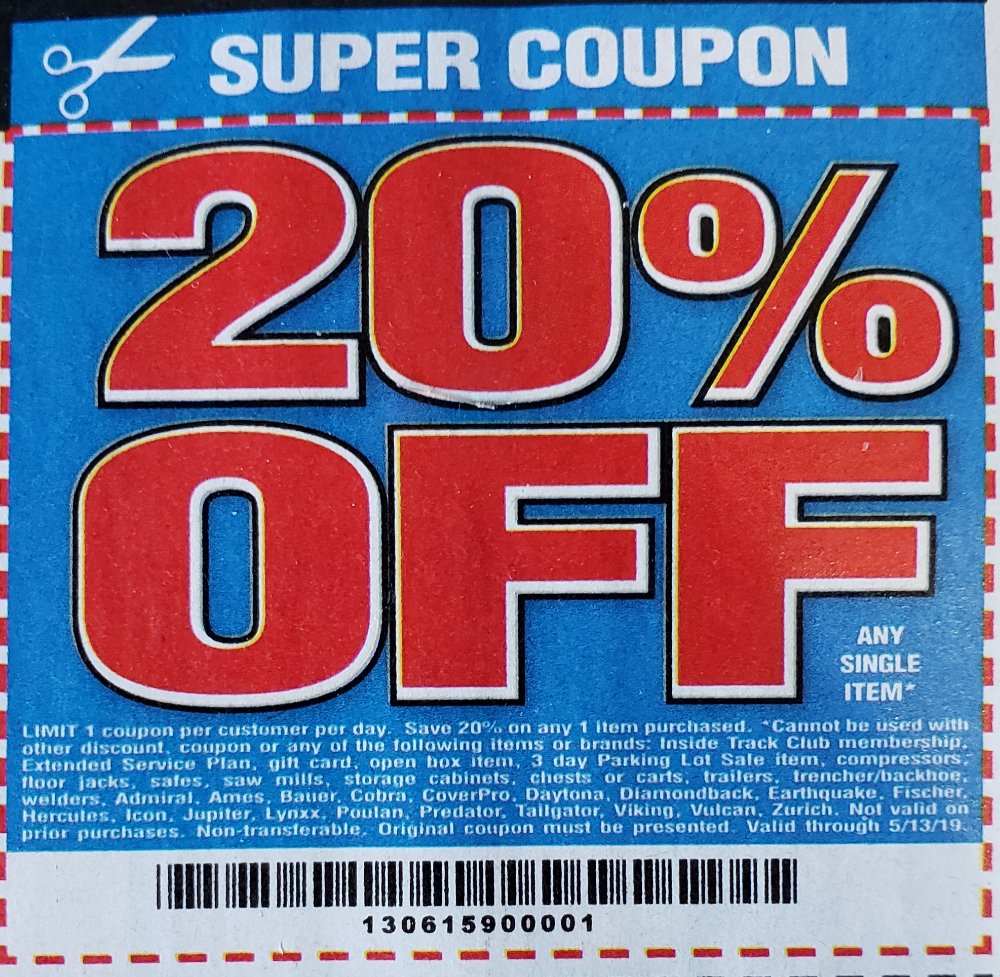 Guide to Harbor Freight Coupons, Deals and Free Stuff Step 3: 20% Off One Item Coupons There is no reason to walk into Harbor Freight without a 20% (or sometimes 25%) off coupon! 20% off one item coupons should be easy to use right? I see this get used incorrectly often. A few quick pointers They do work with with items on sale Check the expiration date before checking out