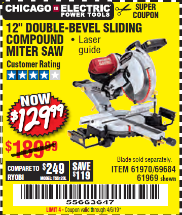 CHICAGO ELECTRIC 12 in. Dual-Bevel Sliding ... See the coupon for details.Compare our price of $129.99 to Professional Woodworker at $218.71 (model number: 8637). Save $88 by shopping at Harbor Freight. CHICAGO ELECTRIC 12 in. Dual-Bevel Sliding Compound ... See the coupon for details.Compare our price of $129.99 to Professional Woodworker at $218.71 (model number: 8637). Save $88 by shopping at Harbor Freight.