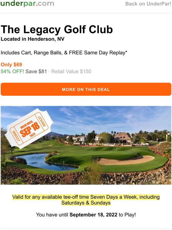 Eagle Crest Golf Club - San Diego Golf Deals - UnderPar $55 Retail Price $134 • Save $39.50 / person 1 BUY NOW Valid for any for available tee time Monday - Friday, or for use after 12:00 PM on Saturdays & Sundays (You have until December 19, 2022 to Play!) Includes shared cart rental TWO Players enjoy One Round of Golf (18 holes per player) One small bucket of range balls (shared)