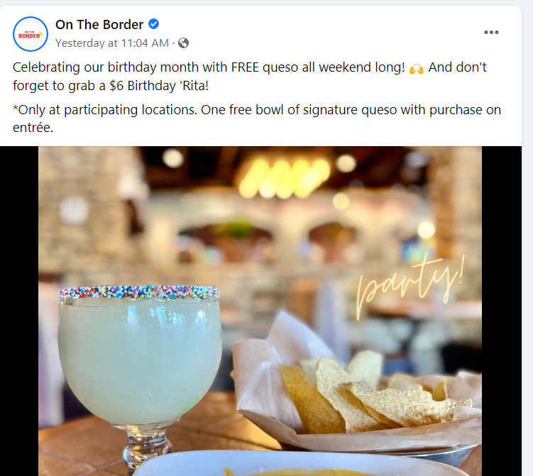 On The Border Coupon Code: Free Queso with the purchase of an entrée an 5 Coupon Codes Available 3 Online Coupons 2 Coupon Codes added this week New Coupon On The Border Free Queso with the purchase of an entrée and $6 Birthday Rita Offer is valid thru 10/23 Mention to server At participating locations. In-Store Only Expires: Oct-23-2022 Get Deal Comment New Coupon On The Border